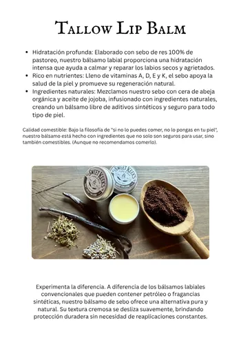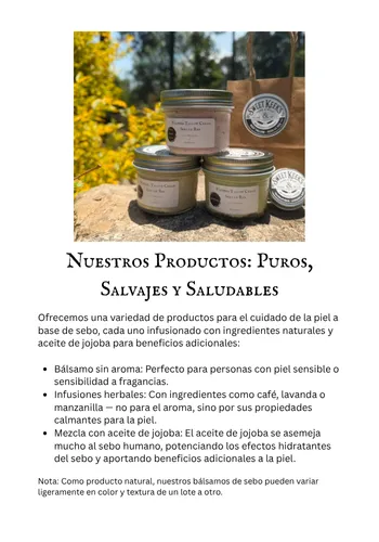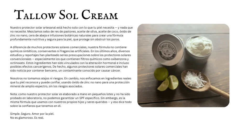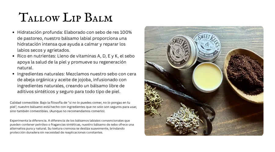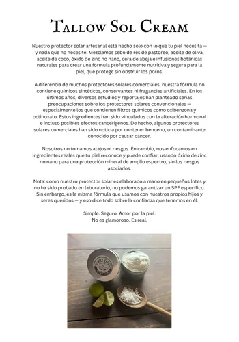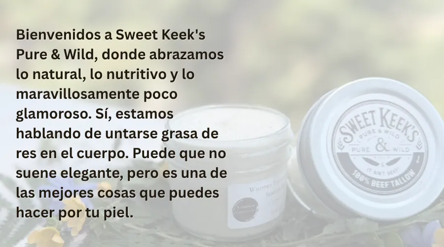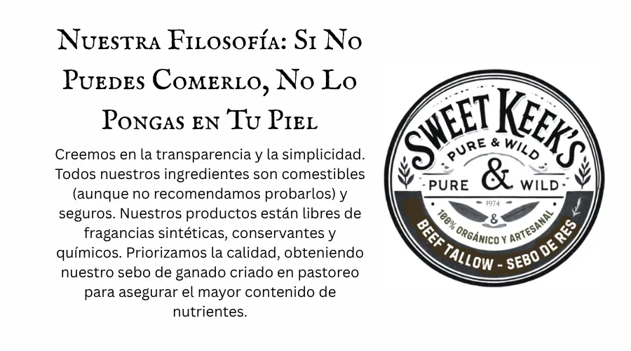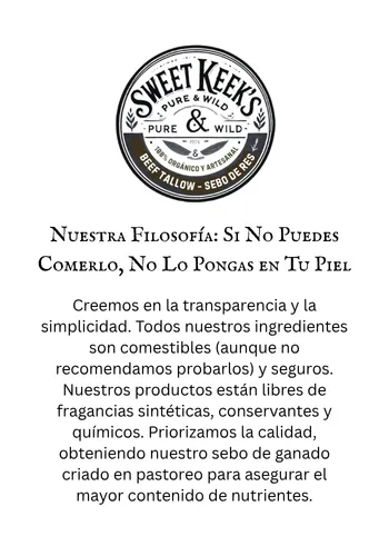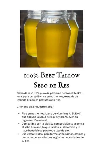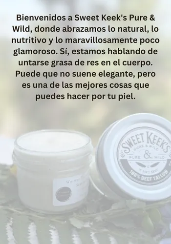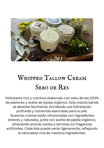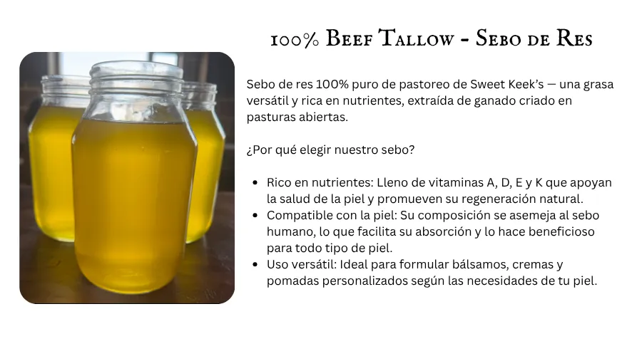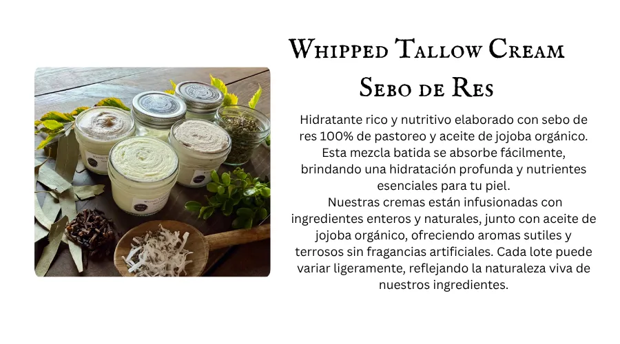 El sebo es una grasa rica en nutrientes obtenida del tejido graso de reses alimentadas con pasto. Su estructura es increíblemente similar a los aceites naturales de la piel humana, lo que lo hace profundamente nutritivo, no comedogénico y fácil de absorber. Lo usamos porque es real, ancestral y no tiene comparación en su capacidad para restaurar y proteger la piel.